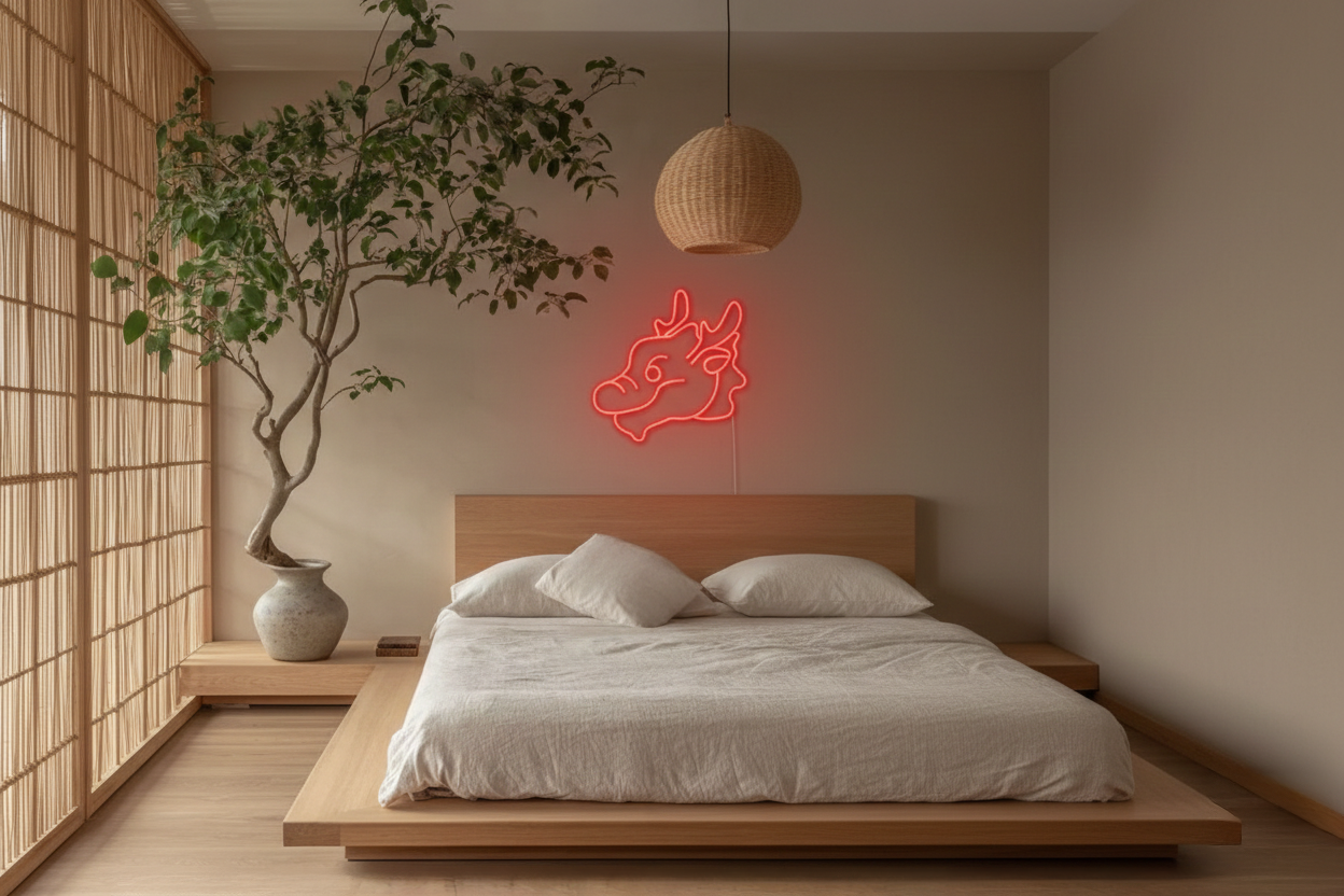 The product is a wall-mounted light sign utilizing Neon LED technology on a shaped transparent acrylic base. The design reproduces the stylized profile of a dragon's head, characterized by an intense red light emission. The hardware is engineered for simplified wall mounting and is powered by a low-voltage system with an integrated cable, optimizing energy consumption and the operational lifespan of the lighting module.
