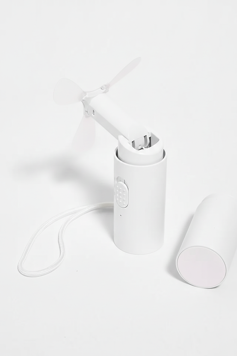 The product is a rechargeable pocket fan featuring a retractable blade system that protects the components when the device is not in use. The cylindrical structure is made of matte thermoplastic material with a soft-touch finish and includes an integrated safety lanyard. The rotation mechanism is engineered to ensure constant airflow with low acoustic impact, optimizing the efficiency of the internal battery.